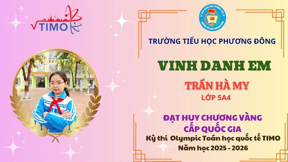 Tri thức là hành trình không biên giới. Với tinh thần ham học hỏi, bản lĩnh và niềm đam mê chinh phục những đỉnh cao tri thức, học sinh Trường Tiểu học Phương Đông đã tự tin tham gia Cuộc thi Toán quốc tế TIMO (Thailand International Mathematical Olympiad) và xuất sắc ghi dấu ấn bằng những thành tích đáng tự hào. TIMO là sân chơi Toán học uy tín,...